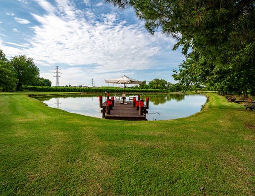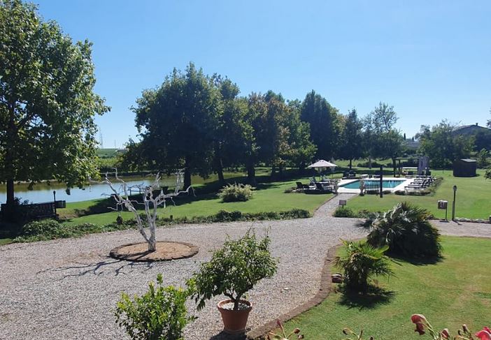 Outside, the large green spaces are equipped with comfortable relaxation areas furnished with parasols and sun loungers, a wooden gazebo with barbecue, a children’s play area and a pond for sports fishing.