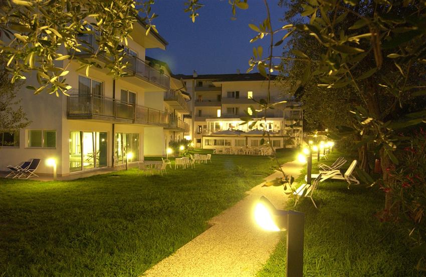 The Hotel is immersed in a luxurious garden with an olive grove and tall trees that provide shade for the large pool.