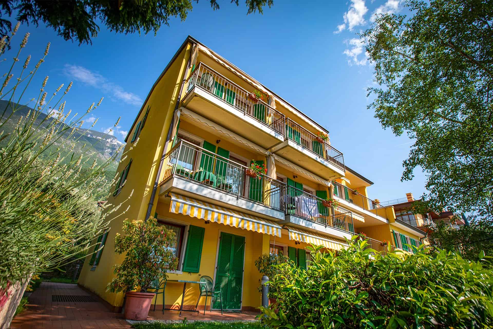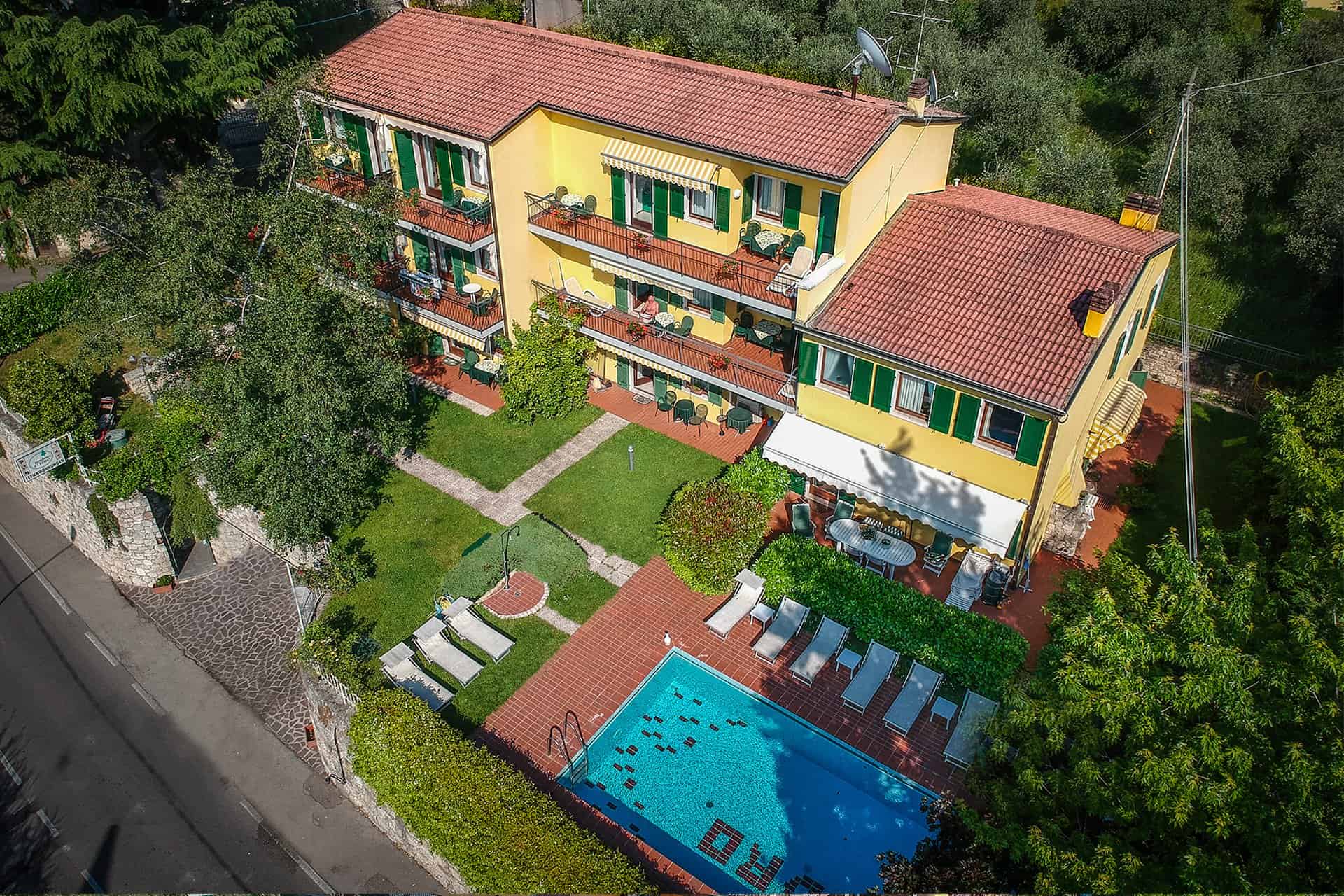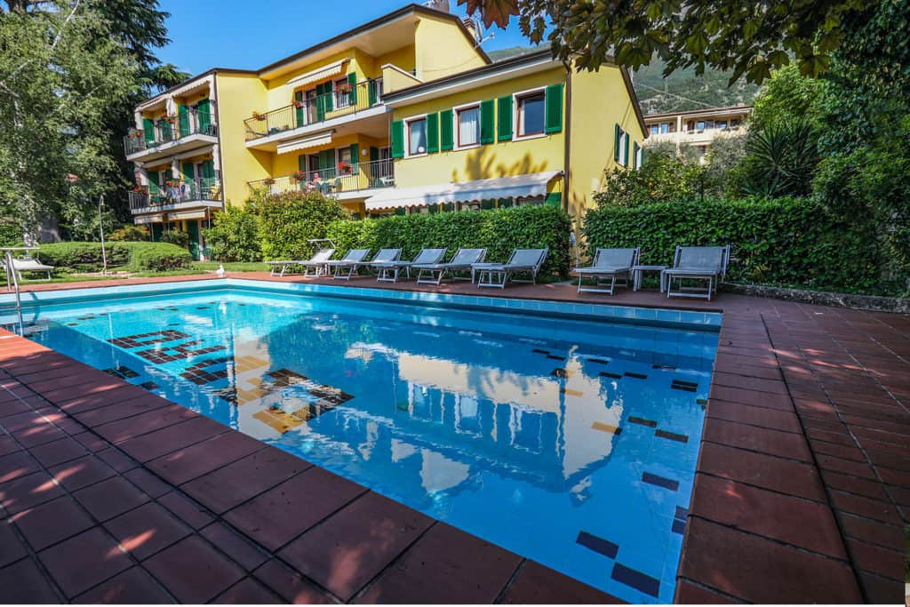 Our residence is enveloped by a small and sunny garden, filled with lemos, oranges and olive trees. Here you’ll find our pool and sunbeds and a wonderful view overlooking the lake and Monte Baldo.