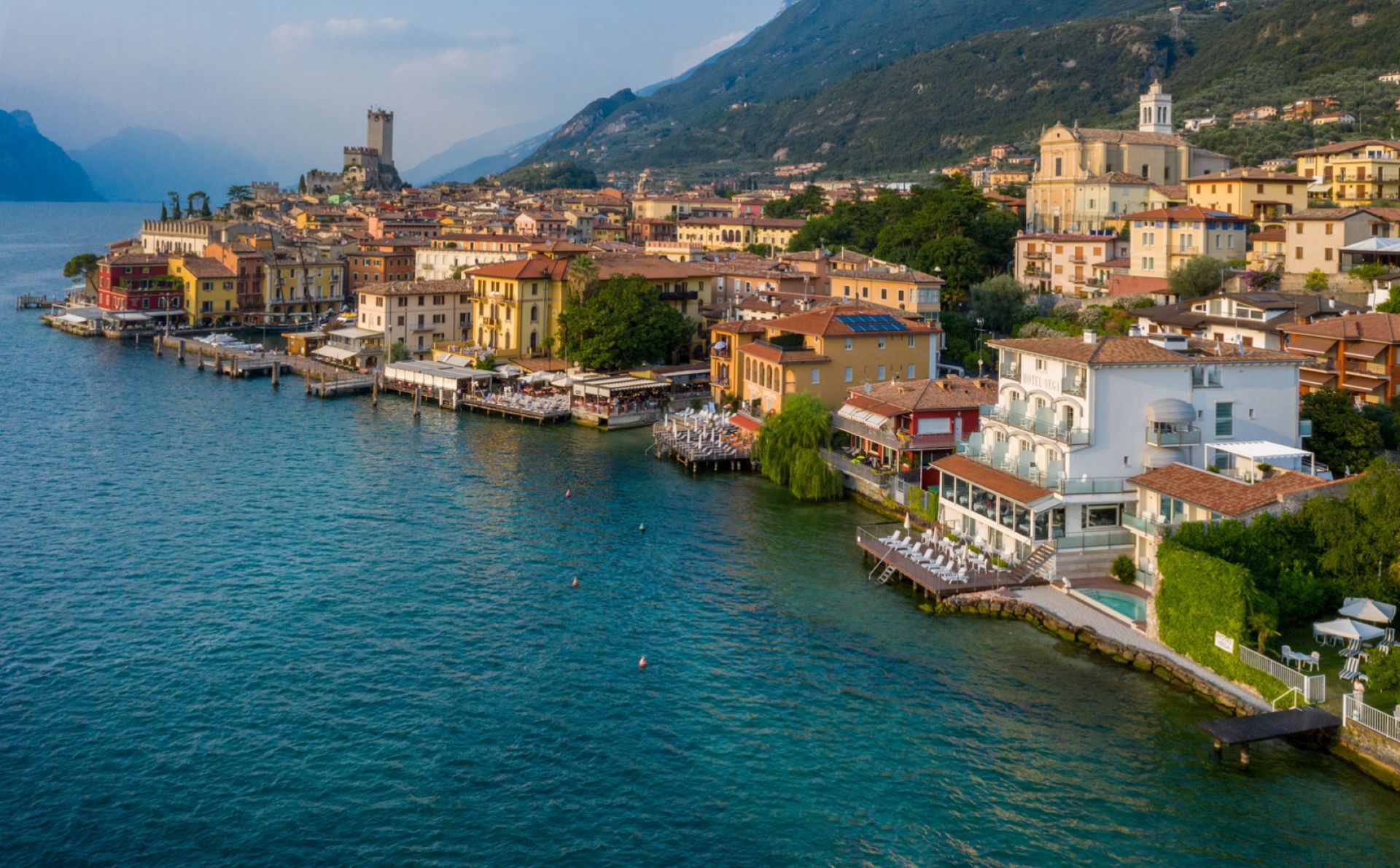 Overlooking the lake, the Hotel Vega is a welcoming and comfortable place. All our en-suite rooms are equipped with shower, balcony, air conditioning, safe deposit box, telephone, minibar and satellite tv. Breakfast buffet is served daily. Excellent cuisine offers Italian and European specialties and the hotel’s bar is ideal to spend a pleasant evening. The lakeside terrace and the garden, with its wealth of Mediterranean vegetation and age-old trees, has direct and private access to the lake, making it a perfect spot to rest and relax. The private parking completes the services offered by the hotel. Narrow alleyways lead from the hotel to the nearby medieval centre of Malcesine, with its old castle that has been sketched through time by famous artists. This historic zone of Lake Garda has a wealth of architectural treasures to admire and enrich your cultural experience. An aerial cableway transports one to Monte Baldo, with its vigorous alpine flora, and invites guests to take mountain hikes and excursions. We at the Hotel Vega will have the pleasure to showing you all that Malcesine and its area has to offer to enjoy your holiday at the most.